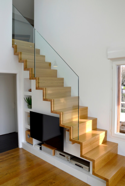 Libéré de ses limons, l’escalier Linéa dessine des lignes pures et va à l’essentiel. Ses marches et contremarches auto-portées lui permettent de se tenir ouvert dans un séjour, comme d’habiller une arrivée de sous-sol ou différentes solutions d’aménagement.