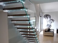 • Par son principe de construction où les limons sont remplacés par un ancrage des marches côté mur et une main courante porteuse côté jour donnant l’impression d’un escalier « en lévitation »