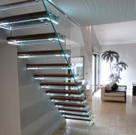 • Pour ceux qui souhaitent voir seulement « flotter » les marches, la structure porteuse peut être dissimulée au plafond ou devenir tout verre