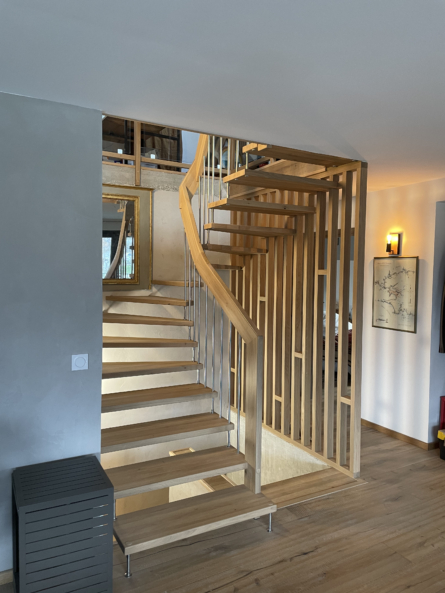 – L’alternative optimale à l’escalier colimaçon ou hélicoïdal, il offre un meilleur rapport confort / encombrement sans porte-à-faux assurant sa stabilité dans le temps