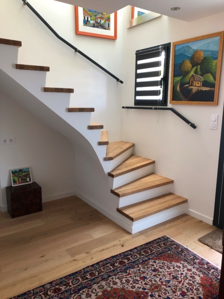 Cette technique permet d’uniformiser les hauteurs de marches et le bois massif en lamelles filantes apporte un revêtement noble et durable à l’escalier béton.